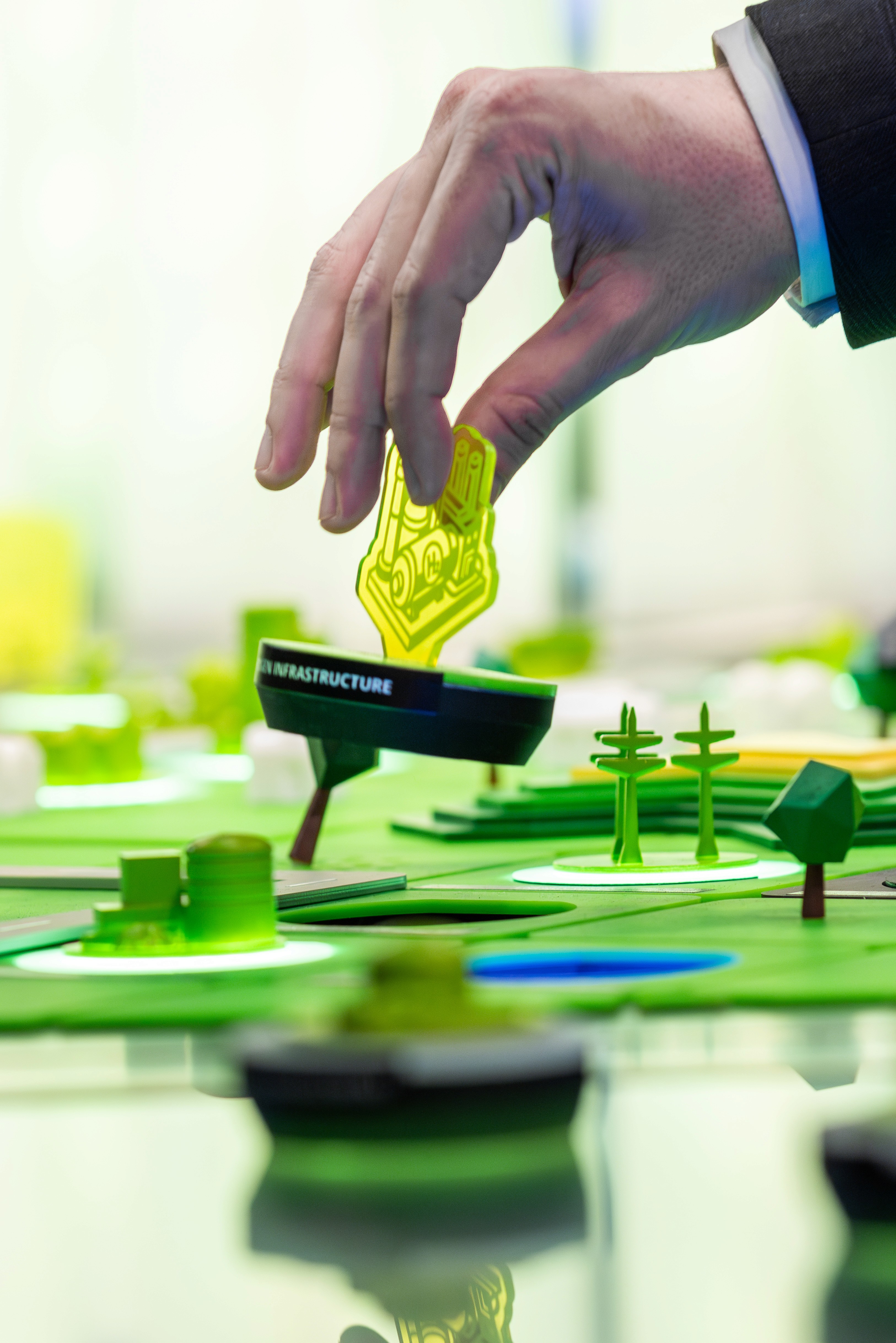 Pick up a tile โ say, โEnergy Gridโ โ place it on the screen, and watch the city respond. LEDs guide you to related infrastructure. The screen reveals case studies, connections, trade-offs. Abstract strategy becomes physical discovery.